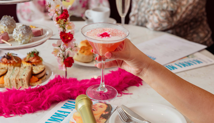 A desszertek legalább ennyire látványosak: a Sophie’s Dream Lemon Drizzle Gateau könnyed citromos sütemény, amelyet játékos cukorvattakorona díszít, míg a Gimme! Gimme! Gimme! egy gazdag csokoládés-mogyorós desszert formájában érkezik. A kihagyhatatlan brit klasszikus, a scone sem maradhat el – itt találóan The Winner Takes The Scone néven, alvadt tejszínnel és málnalekvárral kínálják.