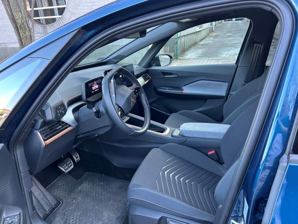 A Born beltere a Volkswagen ID.3-hoz képest több színt, karakteresebb formákat és sportos részleteket kapott. A vastag karimájú, bronz díszítésű kormány jól kézre áll, a mintás dekorbetétek és a szürke mű-Alcantara kárpitozás színes varrással otthonosabbá teszik a kabint. A sportülések jó oldaltartást adnak, hosszú távon is kényelmesek, és elöl a helykínálat bőséges.