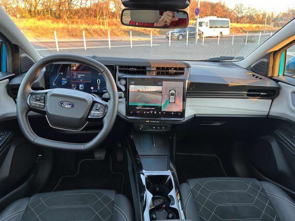 Kívülről szinte minden a helyén maradt. A forma ismerős, az arányok ugyanazok, a karakter változatlan. Csak az apró részletek árulkodnak: elől a Mustang Mach-e esetében megszokott zárt hűtőrács, a finoman átdolgozott front rész, és persze a zöld rendszám. Mert ez az autó nem akarja harsányan kommunikálni, hogy elektromos – inkább természetesen simul bele a városi környezetbe.