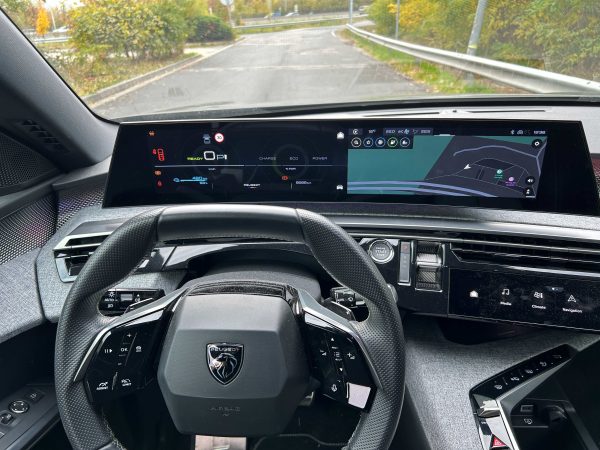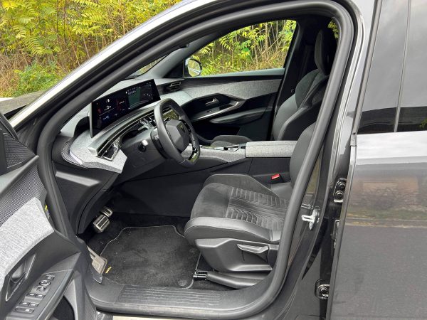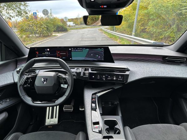 Az utastér egyértelműen az autó egyik legnagyobb erőssége. A Peugeot itt is azt hozza, amiben hagyományosan erős: egyedi módon trendi és stílusos világot teremt. Az anyaghasználat különleges, a szövetes, kissé textilszerű betétek egyedivé teszik a kabint, a hangulatvilágítás sokat dob az összképen, a formák pedig egyszerre modernek és otthonosak. Az elektromos autók többségével ellentétben nem egy futurisztikus, vagy steril technikai tér fogad bennünket, hanem egy olyan kreatív belső, amelybe jó megérkezni és jó elindulni is. A magasabb, GT felszereltség ehhez még hozzátesz némi plusz látványt és minőségérzetet.
