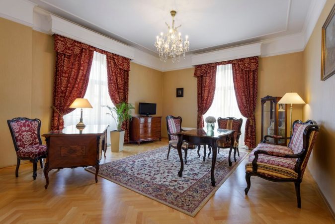 A lakosztályba lépve az embernek az az érzése támad, mintha egy polgári lakás előszobájából a nagyszobába érkezne. A tágas belső tér, az előtérbe, illetve a hálószobába nyíló ajtók, az előszoba tükrös fala olyan klasszikus miliőt teremtenek, amilyet csak a hasonló történelmi épületekben élhetünk át. A klasszikus bútorokkal berendezett nappali nagypolgári világot idéző részletgazdagsága is egészen egyedi: egy talapzaton álló valódi szobor jelzi, hogy itt az esztétika több, mint puszta dekoráció. A sarokban a boldog békeévek világába visszarepítve áll a klasszikus fából készült szobainas, amely a nadrág élét úgy őrzi, hogy a tetején a zakó is elegánsan megpihenhet. A hálószobában pedig a klasszikus tér és a modern kényelem találkozik: a magas, alvásbarát matrac még a forgalmas belváros közepén is pihentető éjszakát kínál.