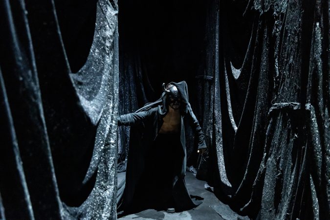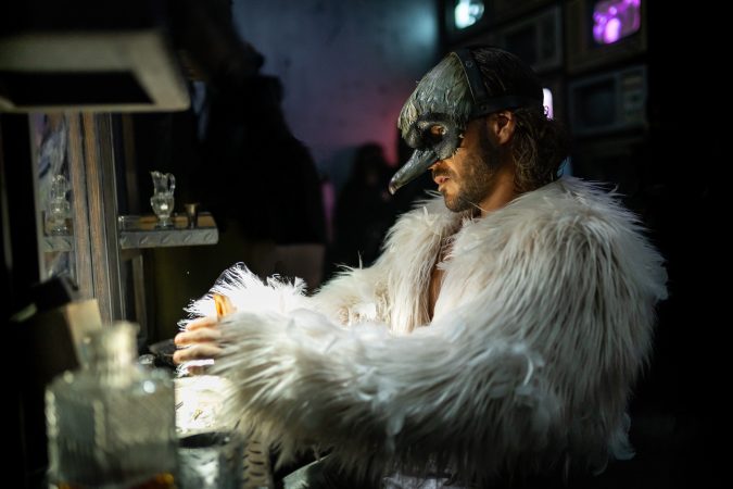 Az élmény már jóval azelőtt elkezdődik, hogy egyetlen szereplőt is meglátnánk. A ruhatár után a Chaos bár névre keresztelt térbe jutunk, amelynek félhomályos, élőzenével telített atmoszférája szinte észrevétlenül hangol át bennünket arra a valóságra, amelybe hamarosan belépünk. Az előadótérbe lépés előtt egy fekete maszkot kapunk. A bárban még nem kötelező viselni, odabent azonban már igen. A szerepe pedig jóval túlmutat az esztétikai hatáson. A maszk ugyanis a produkció mögött működő összetett logisztikai rendszer egyik kulcseleme. A nézők feketét viselnek, a térben jelen lévő koordinátorok fehéret, miközben egyedül a szereplők maradnak maszk nélkül. Mivel szabadon mozoghatunk a térben, és a művészek egészen karnyújtásnyira léteznek körülöttünk, ez a vizuális megkülönböztetés elengedhetetlen ahhoz, hogy a világ rendje ne boruljon fel.