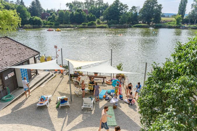 A tó több mint 200 méteres partszakasszal várja a látogatókat, amelynek fele füves, fele betonozott kialakítású. A belépőjegy tartalmazza a napozóágyak használatát, és értékmegőrző is a vendégek rendelkezésére áll. A gyerekeket külön medence és játszótér várja, míg a napozni vágyók a füves területen vagy a tó fölé nyúló napozómólókon pihenhetnek.